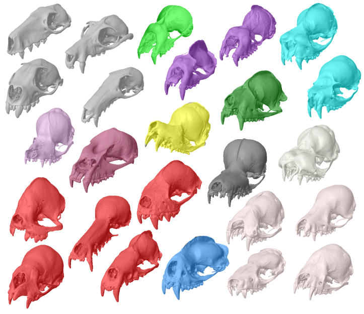 How did bats come to possess such an amazing variety of skull shapes? I have been using shape data collected from CT scans of skulls from more than 200 species, to understand the evolution of the cranium and mandible. In a paper currently under review, I used phylogenetic comparative methods to examine changes in shape evolution within the skull, and showed that different ecological pressures have impacted the diversification of the bat skull at different times and in different ways. Early skull evolution was dominated by shape changes associated with echolocation, while later diversification was more strongly influenced by dietary factors. The putative adaptive radiation in New World Leaf-Nosed Bats was associated with more changes in skull shape than any other family. The morphological diversification of bats can help us to understand the link between ecological adaptation and evolution.